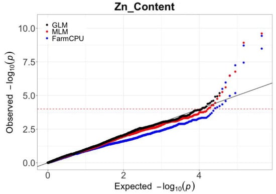 Quantile–quantile (QQ) plots for wheat grains zinc accumulation using three models. Black dots, GLM model; Red dots, MLM model; Blue dots, FarmCPU model; The black line indicates the expected values; The red dotted line indicate the −log10(p) threshold of 4.0.