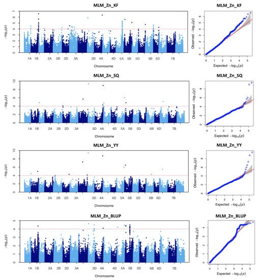 Manhattan and QQ plots of genome-wide association scan for wheat grains zinc accumulation in the 207 wheat association mapping population using the mixed linear model (MLM) in GAPIT software. Each dot represents a SNP. The horizontal dashed line represents the significant threshold −log10(p) equaling 4.0. The SNPs above the red dotted line are all significantly associated with Zn grain variation. Quantile–quantile plots resulting from genome-wide association study (GWAS) results using MLM model for wheat grains zinc accumulation in different environments. MLM_Zn_YY, mixed linear model results obtained from the Yuanyang location; MLM_Zn_KF, mixed linear model results obtained from the Kaifeng location, MLM_Zn_SQ, mixed linear model results obtained from the Shangqiu location, MLM_Zn_BLUP mixed linear model results obtained from the BLUP location.