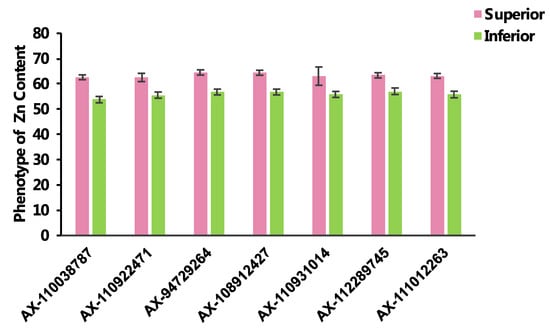 The phenotypic performance in cultivars with superior alleles and inferior alleles in seven repetitive significantly SNPs loci for grains zinc accumulation. Pink bars represent superior alleles phenotype value; Green bars represent superior alleles phenotype value.