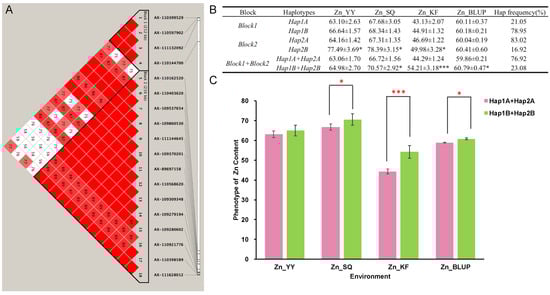 Haplotype analysis for the significant SNPs on chromosome 1B for wheat grains zinc accumulation. (A) Haplotype heatmap surrounding significant SNPs on chromosome 1B; (B) Analysis of variance for haplotypes with different alleles and haplotype combinations in the two blocks; (C) Comparison between superior and inferior haplotypes based on phenotypic values collected from the four environments. Two symbols (* and ***) correspond to two p-values (0.05 and 0.001, respectively).