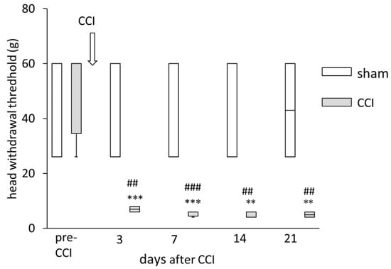 The time course of changes in head-withdrawal threshold of chronic constriction injury of the infraorbital nerve (ION-CCI) in rats. Data are shown as box and whisker plots. The bottom and top of the box indicate the first and third quartiles, respectively. The end of the whiskers represents the minimum and maximum values of all data. Rats with ION-CCI showed mechanical hypersensitivity from 3 to 21 days after nerve ligation; they showed a significant decrease in head-withdrawal thresholds as compared with sham-operated rats on 3, 7, 14, and 21 days after ION-CCI. Rats with ION-CCI showed a significant decrease in head-withdrawal thresholds to mechanical stimulation 3 days after ION-CCI as compared with before ION-CCI; this decrease lasted until 21 days after nerve ligation. *** p < 0.001 compared with head-withdrawal threshold before ION-CCI. ** p < 0.01 compared with head-withdrawal threshold before ION-CCI. ### p < 0.001 compared with head-withdrawal threshold of sham-operated rats on the same time. ## p < 0.01 compared with head-withdrawal threshold of sham-operated rats on the same time.