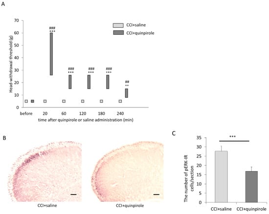 Effects of intraperitoneal (i.p.) administration of quinpirole (1 mg/kg) on ION-CCI. (A) The change in head-withdrawal threshold after quinpirole administration. Data are shown as box and whisker plots. The bottom and top of the box indicate the first and third quartiles, respectively. The end of the whiskers represents the minimum and maximum values of all data. Fourteen days after ION-CCI, ION-CCI rats that received i.p. administration of quinpirole showed a significant increase in head-withdrawal thresholds 20, 60, 120, 180, and 240 min after the administration of quinpirole as compared with thresholds before drug administration. *** p < 0.001 compared with head-withdrawal threshold before administration. ** p < 0.01 compared with head-withdrawal threshold before administration. The head-withdrawal threshold of ION-CCI rats with i.p. administration of quinpirole was larger than that of ION-CCI rats with i.p. administration of saline at 20, 60, 120, 180, and 240 min after administration. ### p < 0.001 compared with head-withdrawal threshold of ION-CCI rats that received saline administration at the same time. ## p < 0.01 compared with head-withdrawal threshold of ION-CCI rats that received saline administration at the same time. (B) Photomicrograph of phosphorylated extracellular signal-regulated kinase (pERK) in the superficial layers of the trigeminal spinal subnucleus caudalis (Vc) of ION-CCI rats that received saline or quinpirole administrations. Scale bar represents 100 µm. (C) The number of pERK immunoreactive (pERK-IR) cells/section in the Vc (mean ± SEM). The number of pERK-IR cells/section in the Vc of ION-CCI rats that received quinpirole administrations was significantly larger than that of ION-CCI rats that received saline administrations. *** p < 0.001.
