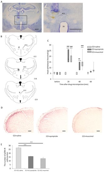 To assess the effects of the change of A11 nucleus activity on the mechanical hypersensitivity induced by ION-CCI, quinpirole or muscimol (a GABAA receptor agonist, Sigma, St. Louis, MO, USA) was microinjected into the A11 nucleus 14 days after nerve ligation. At 7 days after ION-CCI, ION-CCI rats were anesthetized by i.p. administration of saline solution mixed with 2.0 mg/kg midazolam, 2.5 mg/kg butorphanol, and 0.375 mg/kg medetomidine and then placed in a stereotaxic apparatus (Narishige, Tokyo, Japan) with the incisor bar set 3.3 mm below the level of the ear bars. A tiny hole was made in the skull with a drill, and a metal 26-gauge stainless steel guide cannula (Bio Research Center, Aichi, Japan) was implanted for microinjection of drugs into the A11 nucleus. Stereotaxic coordinates were 3.9 mm caudal to the bregma, 0.5 mm left of the midline, and 6 mm ventral to the dural surface, which was 1 mm above the A11 injection site []. Screws were placed around the cannula into the skull and the cannula was affixed with dental cement. A dummy cannula was inserted into the guide cannula to ensure patency until the time of microinjection. Seven days after the implantation of the cannula, quinpirole (20 µg in 0.25 µL), muscimol (0.07µg in 0.25 µL), or saline (0.25 µL) was microinjected into the left A11 nucleus []. The dummy cannula was removed, and a 33-gauge internal cannula was inserted into the guide cannula. Solutions were administered through the internal cannula connected to a 1-µL Hamilton syringe via a polyethylene tube. The tip of the internal cannula was placed 3.9 mm caudal to the bregma, 0.5 mm left of the midline, and 7 mm ventral to the dural surface—it protruded 1 mm from the end of the guide cannula. The microinjections were performed slowly over a 1-min period. Head-withdrawal thresholds were measured before and 20, 40, and 60 min after drug administration. Measurement of head-withdrawal thresholds was performed using a blind protocol, so that the investigator measuring head-withdrawal thresholds was unaware of which experimental procedures had been performed.