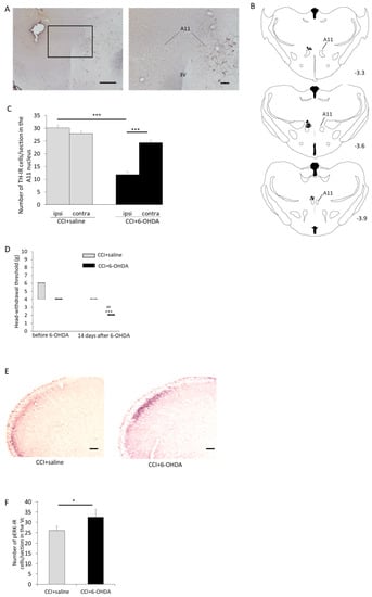To assess the effect of destruction of dopaminergic neurons in the A11 nucleus on mechanical hypersensitivity induced by ION-CCI, 6-OHDA was microinjected into the A11 nucleus. Seven days after nerve ligation, 6-OHDA was injected into the A11 nucleus of ION-CCI rats. Thirty minutes prior to surgery, ION-CCI rats received an i.p. injection of desipramine hydrochloride (20 mg/kg, Sigma, St. Louis, MO, USA) to protect noradrenergic neurons and fibers [,]. ION-CCI rats then were anesthetized by i.p. administration of saline solution mixed with 2.0 mg/kg midazolam, 2.5 mg/kg butorphanol, and 0.375 mg/kg medetomidine and placed in a stereotaxic apparatus (Narishige, Tokyo, Japan) with the incisor bar set 3.3 mm below the level of the ear bars. Next, 2 mg of 6-OHDA (Sigma, St. Louis, MO, USA) in 1 mL of sterile saline containing 0.01% ascorbic acid was injected into the left A11 nucleus [,,]. Stereotaxic coordinates for the 6-OHDA injection site were 3.9 mm caudal to the bregma, 0.5 mm left of the midline, and 7 mm ventral to the dural surface. The 6-OHDA solution was administered through a 30-gauge cannula with a microinjection pump (Nihon Kohden, Tokyo, Japan) at 1 µL/min for 1 min; the cannula was left in place for 5 min after completion of the injection. The same amount of saline was injected into ION-CCI rats for control.