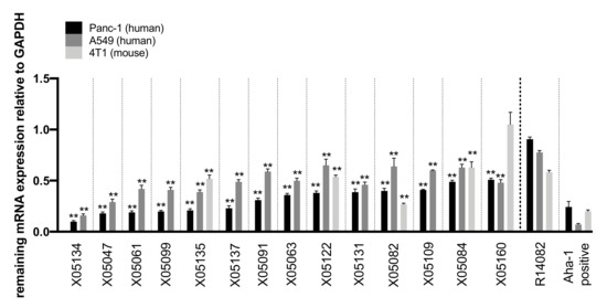 For setting up screening conditions, A549 cells (8,000 cells/well) were transfected with 20 nM and 5 nM of each new candidate and negative control (R14082 -ASO against Aha-4 (aryl hydrocarbon receptor nuclear translocator homolog-4): Gbs Abs dTs dTs dTs dGs dTs dGs dTs dCs Abs Gbs Gb) and positive control (ASO against Aha-1: Tbs Cbs dAs dCs dAs dCs dTs dAs dAs dTs Cbs Tbs Cb) using 0.2 µl/ 96 well Lipofectamine ® 2000 (ThermoFisher Scientific, Darmstadt, Germany) for 72 h without medium change. In a 2nd screening round the most active 30 candidates were used for transfection in Panc-1, A549 and 4T1 cells. To simulate a more realistic scenario for in-vivo studies, cells were treated without transfection agents (gymnotic conditions) in all following screenings. R14082 and PBS-treated cells were used as controls. In addition, an LNA-ASO control directed against Aha-1 served as positive control for an effective downregulation of Aha-1 to confirm successful assay-performance. Here, 10,000 cells/well of Panc-1, 8,000 cells/well of A549 and 8,000 cells/well of 4T1 (7.5 µM) cells were plated into 96-well plates. Cells were incubated with 5 µM (Panc-1) and 7.5 µM (A549, 4T1) of each ASO for 72 h without medium change before being harvested. In a 3rd screening round, 12 new derivates of 6 parental sequences of screening round 2 were tested by gymnotically delivery of A549 (7.5 µM), Panc-1 (5 µM) and 4T1 cells (7.5 µM) as described for screening round 2. For all screening rounds data were obtained after 72 h by bDNA assay.