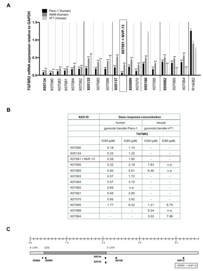 The binding sites of parental sequences and of their derivatives are displayed in Figure 3C. Results show that LNA pattern modifications changed the activity of certain sequences so that some derivatives were even more active than their parental sequence (Figure 3A): X07070, X07091 = NVP-13 and X07095 reduced TGFBR2 mRNA twice as much as their parental sequences in Panc-1 cells (X07070: 0.07 ± 0.01 vs 0.22 ± 0.01, X07091 = NVP-13: 0.12 ± 0.02 vs 0.24 ± 0.02 and X07095: 0.17 ± 0.04 vs 0.33 ± 0.04, respectively). To assess potency of the most promising ASOs, their IC50 and IC80 were determined in Panc-1 and 4T1 cells (Figure 3B). X05134, X07080 and X07091 = NVP-13 had half-maximal inhibitory concentrations below 0.3 µM (X05134: 0.23 µM, X07080: 0.18 µM and X07091: 0.26 µM respectively). In conclusion, LNA pattern modifications yielded very potent candidates in targeting TGFBR2.