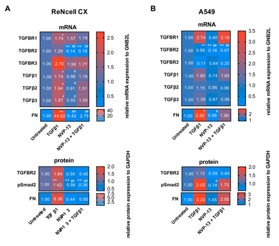 Gymnotic transfer of NVP-13 is efficacious. Heatmaps of mRNA (qRT-PCR) and protein levels (western blot) for TGFβ signaling in ReNcell CX® (A) and A549 cells (B) are shown. ReNcell CX®: mRNA and protein levels after 4 d of pre-treatment with TGFβ1 (50 ng/mL) and 8 d gymnotic transfer of NVP-13 (10 µM) in presence of TGFβ1. A549 cells were pre-treated with TGFβ1 (10 ng/mL) for 2 d followed by 3 d gymnotic transfer of NVP-13 (10 µM) in presence of TGFβ1. Quantitative RT-qPCR and Western Blotting showed a decrease of all tested proteins after gymnotic transfer of NVP-13 with TGFβ1 co-treatment. mRNA levels were normalized to the housekeeper Gnb2l and to untreated cells. Densitometric analysis of protein levels were normalized in reference to GAPDH, n ≥ 3. All statistics were calculated using the Ordinary-one-way-ANOVA followed by “Tukey’s” multiple post hoc comparison. (* vs. Untreated: *p ≦ 0.05, **p ≦ 0.01, # vs. TGFβ1: #p ≦ 0.05, #p ≦ 0.01). Immunocytochemical staining against TGFBR2, pSmad2 and FN of ReNcell CX® cells (C) and A549 (D) confirmed observations of western blot and mRNA results. TGFBR2 (red), pSmad2 (red) and FN (green). Examination of cells was performed by fluorescence microscopy (Zeiss, Zeiss Axio® Observer.Z1). Images were analyzed with Image J Software and CorelDRAW® X7 Software. N = 3.