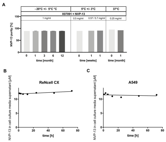 In-use stability of lead candidate X07091 = NVP-13. (A) Integrity of NVP-13 in 0.9 % NaCl (saline) when incubated with different temperature conditions and for different time intervals. For incubation at −20 °C +/− 5 °C a denaturizing Ion-Pair-Reversed-Pair High Performance Liquid Chromatography (IP-RP-HPLC) with Electrospray-Ionization (ESI)/Mass Spectrometry (MS) was used for determination of relative purity and identity of NVP-13. Aliquots incubated at 5 °C +/− 3 °C were analyzed using an IP-RP-HPLC combined with UV/Mass spectrometry and samples incubated at 37 °C (37 °C as adjusted by the integrated thermostat of New Brunswick Galaxy 170 S Incubator, Eppendorf) were analyzed using IP-RP-UPLC with UV/ESI/MS. Results showed that NVP-13 content was stable under all tested conditions. Discrepancy for content and purity/integrity were within method variability. Values are given as mean and SEM. Determination of intact NVP-13 with a specific bioprobe in the supernatant of cell culture media supernatant of ReNcell CX® (B) and A549 cells (C) after incubation with 10 µM NVP-13 for up to 72 h, n = 3. Line of best fit for (B) and (C) was calculated by a nonlinear fit function.