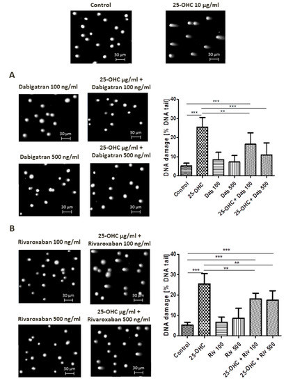 Alkaline comet assay allows the detection of DNA damage manifested as SSBs, DSBs and alkali labile sites (ALSs). At a concentration of 10 µg/mL, 25-hydroxycholesterol administration increased DNA damage. This DNA damage was reduced by dabigatran and rivaroxaban; however, only 500 ng/mL dabigatran was able to completely repair the induced DNA strand breaks, i.e., return them to control levels.