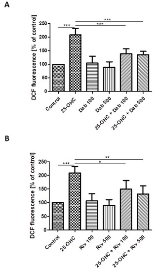 Changes in reactive oxygen species (DCF fluorescence) in HUVECs incubated with 25-hydroxycholesterol (10 µg/mL), (A) dabigatran (100 ng/mL and 500 ng/mL) and (B) rivaroxaban (100 ng/mL and 500 ng/mL). Mean ± SD calculated from nine individual experiments. Significant differences from negative controls are indicated by * p < 0.05; ** p < 0.01; *** p < 0.001. Statistical analysis was conducted using one-way ANOVA and post-hoc Tukey’s test.