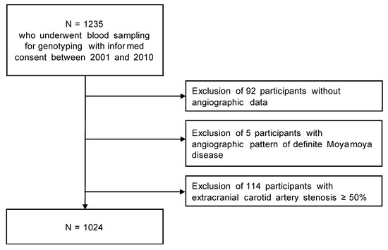 Study subjects were consecutively recruited from the Department of Neurology at CHA Bundang Medical Center, CHA University (an 800-bed teaching hospital in Gyeonggi-do, South Korea), between 2001 and 2010 (Figure 2). Subjects were selected from those who underwent blood sampling for genotyping and cerebral angiographic evaluation by MRA or computed tomography angiography (CTA). Patients with proximal carotid artery occlusion were excluded because the proximal carotid occlusion often does not allow the evaluation of intracranial arteries. Individuals who satisfied the criteria for definite MMD were excluded from the study [43,46]. The medical records were reviewed to identify the presence of hypertension, DM, hyperlipidemia, atrial fibrillation, or ischemic stroke. Hypertension was defined as use of antihypertensive medication or a resting systolic blood pressure ≥140 mmHg or resting diastolic blood pressure ≥90 mmHg on repeated measurements. DM was defined as use of antidiabetic medications or a fasting plasma glucose ≥7.0 mmol/L or glycosylated hemoglobin ≥6.5%. Hypercholesterolemia was defined as use of lipid-lowering agents or a low-density lipoprotein cholesterol ≥4.1 mmol/L or total cholesterol ≥6.2 mmol/L. Ischemic stroke was defined as acute neurological dysfunction of vascular origin, confirmed by brain magnetic resonance imaging or computed tomography. All participants provided written informed consent. The study was approved by the Institutional Review Board of CHA Bundang Medical Center (BD2012-136D).