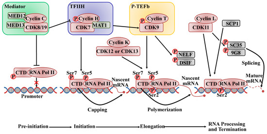 In mammals, production of messenger RNAs (mRNAs) is strictly regulated, and it is divided into discrete phases of initiation, pausing, elongation, and termination, catalyzed by RNA polymerase II (RNAPII), which is composed of a largest subunit (Rpb1) with a C-terminal domain (CTD) repeat of an evolutionarily conserved heptapeptide (Tyr–Ser–Pro–Thr–Ser–Pro–Ser) [35]. The CTD plays a vital role in RNA processing and chromatin organization in the coordination of transcriptional and co-transcriptional events through changing its phosphorylation level [36,37]. Tyr1, Ser2, Thr4, Ser5, and Ser7 are phosphorylated in the heptapeptide by multiple CDK/cyclin subunits, such as CDK1 or CDK2 and most transcriptional CDKs, such as CDK7, CDK8, and CDK9 subfamilies [38]. The phosphorylation at Ser5 and Ser7 of the CTD-RNAPII is required for the transcriptional initiation of the promoters. When the initiating transcription occurs, the Ser5 phosphorylation level decreases, while Ser2 and Tyr1 phosphorylation increases to promote transcriptional elongation. During transcription termination, Tyr1 is dephosphorylated firstly, closely followed by Ser5, Ser7, and Ser2, which permits restarting the transcription cycle [39].