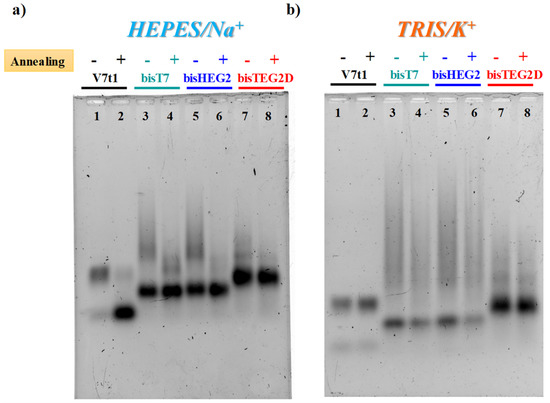 In both gel assays, in the selected HEPES/Na+ buffer, all the investigated V7t1 dimers showed a detectable difference if in N.A. or A. forms, as in the case of V7t1 [17]. In particular, bisV7t1T7 and bisV7t1HEG2 in the N.A. samples migrated as two distinct bands with a marked difference in their electrophoretic mobility (Figure 1a and Figure S4a, lanes 3 and 5), indicative of very different structuring. Indeed, a band with the mobility expected for the dimeric aptamer was found, along with very large species (aggregates or higher order G4 structures) which moved as smeared bands in the agarose gel (Figure 1a, lanes 3 and 5) and hardly entered the polyacrylamide pockets (Figure S4a, lanes 3 and 5). For these samples, upon annealing in the Na+-rich medium, aggregate formation was sensibly reduced as clearly detectable in both gels (Figure 1a, lanes 4 and 6).