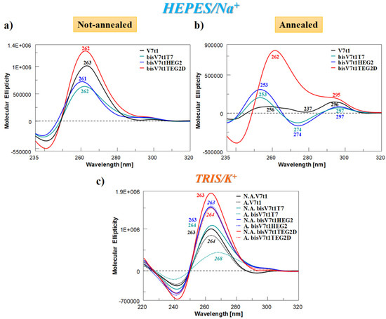 Completely different was the behavior of the A. samples (Figure 3b). In the Na+-rich medium, both A. bisV7t1T7 and bisV7t1HEG2 displayed CD spectra [51,56,57] with two positive bands around 250 and 297 nm (with the latter one rather small with respect to the other) and one negative band centered at 274 nm (Figure 3b). These spectral features can be attributed to the coexistence in solution of multiple G4-conformations, as already observed for the annealed V7t1 sample [17]. Compared to the other A. samples, dramatically different was the CD spectrum of bisV7t1TEG2D (Figure 3b, red line), in which a prevalent CD signal centered at 260 nm was found, along with a detectable band centered at 295 nm. These spectral features revealed for bisV7t1TEG2D a main parallel G4 folding also after annealing, with only minor amounts of coexisting antiparallel or hybrid G4 topologies, however increased compared to the same N.A. sample.