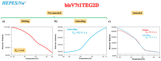 In the case of N.A. bisV7t1T7 analyzed in HEPES/Na+ buffer solution, the CD-melting profile showed a marked decrease of the CD signal upon increasing the temperature (Figure 4a), not showing the typical sigmoidal behavior expected for a unique, cooperative transition, but rather a curve with at least two transitions, one below 50 °C and one at ca. 80 °C. This profile, resembling the one found for V7t1 [17], could be due to the presence of different species in solution (in accordance with the electrophoretic and chromatographic results) and/or to multi-process denaturation pathways. In addition, the CD-annealing profile—not superimposable to the corresponding heating profile—did not show a clearly defined sigmoidal behavior.