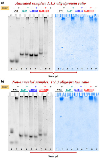 VEGF-binding properties of covalent V7t1 dimers were studied by EMSA experiments under non-denaturing conditions, which is a sensitive and widely used method to detect protein-nucleic acid interactions [61]. In fact, the electrophoretic mobility of an oligonucleotide is typically high when free in solution, and significantly retarded when complexed with its target protein [17,20,61]. In parallel experiments, both N.A. and A. samples were incubated at 4 °C for 30 min with 1.3 eq. of VEGF165 and the resulting mixtures analyzed by 7% native PAGE using the free oligonucleotides as controls. The gels were subjected to a double staining procedure, using first a staining specific for nucleic acids (GelGreen) and then one specific for proteins (Coomassie) [17].