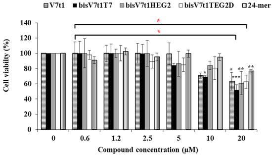 With this general purpose, three covalent V7t1 dimers, here indicated as bisV7t1T7, bisV7t1HEG2 and bisV7t1TEG2D, were ad hoc designed introducing proper connecting linkers with similar overall lengths but different chemical features (Table 1). In detail, in bisV7t1T7 two tandem V7t1 sequences were connected through a T7 linker providing a 57-mer. The selected T7 linker connects the 3′-end of one V7t1 sequence with the 5′-end of the other, thus maintaining the 5′-3′ polarity throughout the dimeric oligonucleotide (Figure S1, Scheme I). This derivative was selected as a reference compound essentially following the approach previously explored by Nonaka et al. in the construction of the bivalent 3R02 analogue [18,37].