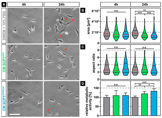 Phase contrast images of C2C12 cells after 4 and 24 hours of exposure to conditioned media (CM) derived from Single clone pick 1 (SCP1)GFP or SCP1GFP/SCX cells led to smaller cells with fewer filopodia (arrowheads) when compared to myoblasts in normal medium (NM) (A). Quantification of the individual cell morphology parameters revealed a significant decrease in cell area (B) but not of the aspect ratio (C). Long-term treatment (24 h) significantly increased the metabolic activity of C2C12 in CM of SCP1GFP or SCP1GFP/SCX cells, when compared to myoblasts in normal medium. Interestingly, the secretome of scleraxis-overexpressing cells led to a higher metabolic activity of C2C12 cells, when compared to CM from SCP1GFP (D). Scale bar: 100 µm. Violin plots represent the median (red line) and quartiles (black lines). Bar plots represent the mean and SD. * equals p ≤ 0.05, ** equals p ≤ 0.01, *** equals p ≤ 0.001, n.s.: not significant. Data were obtained from three randomly selected field-of-views (FOV) of three independent experiments. At least 75 cells per time point and experimental condition were evaluated.