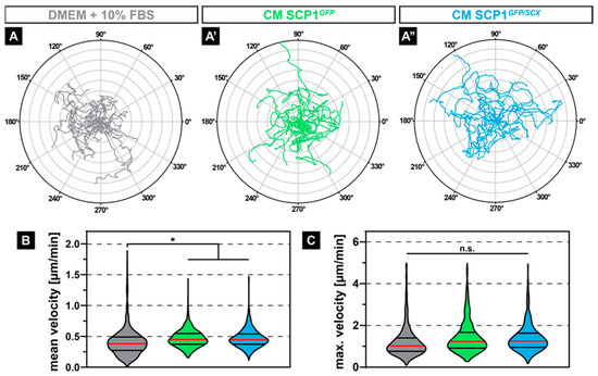Polar plots of 20 exemplary cell migration tracks showed increased random migration and a longer Euclidian distance of myoblasts treated with conditioned media (CM) derived from SCP1GFP or SCP1GFP/SCX cells when compared to C2C12 in standard culture media (A–A’’). Quantification of the migratory parameters confirmed the subjective appearance of the cell tracks, by revealing a significant increase in the mean velocity (B) with an unchanged maximum velocity (C). Distance of concentric circles: 50 µm. Vertical lines in violin plots represent the median (red) and quartiles (black). * equals p ≤ 0.05, n.s.: not significant. Data were obtained from three randomly selected field-of-views (FOV) of three independent experiments. At least 530 cells per experimental condition were evaluated.