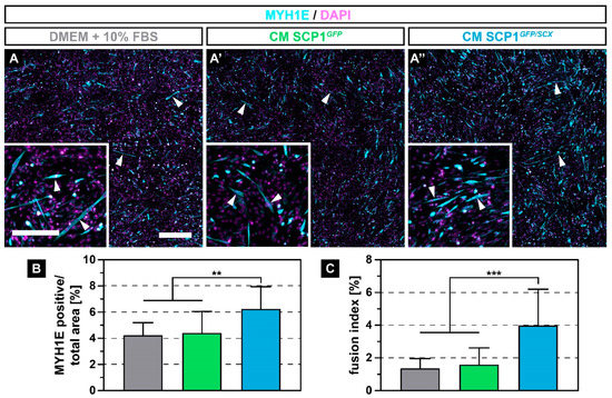 After muscle injury, quiescent satellite cells under the basal lamina of the myofiber start to proliferate and to differentiate into myoblasts that ultimately fuse with damaged, mature muscle fibers to regenerate the defect [22]. Therefore, we investigated how CM derived from SCP1GFP and SCP1GFP/SCX cells affects the fusion of C2C12 cells. After 5 days of myogenic differentiation, myoblasts that were cultured in NM or that were exposed to CM of both SCP1 cell lines formed multi-nucleated myofibers (Figure 3A–A’’, arrowheads). However, C2C12 cells with CM from SCP1GFP/SCX showed more and longer myotubes (Figure 3A’’), when compared to C2C12 in NM or CM from SCP1GFP cells (Figure 3A,A’). Remarkably, quantification of the relative myosin heavy chain 1E (MYH1E) positive area by immunofluorescence staining revealed an approximately 47% increase in differentiated myoblasts in CM from SCP1GFP/SCX cells when compared to myoblasts in NM or CM of SCP1GFP (Figure 3B). In addition, newly formed myofibers that were treated with CM from SCP1GFP/SCX cells showed an approximate 2.5-fold increase in nuclei in MYH1E positive cells (Figure 3C).