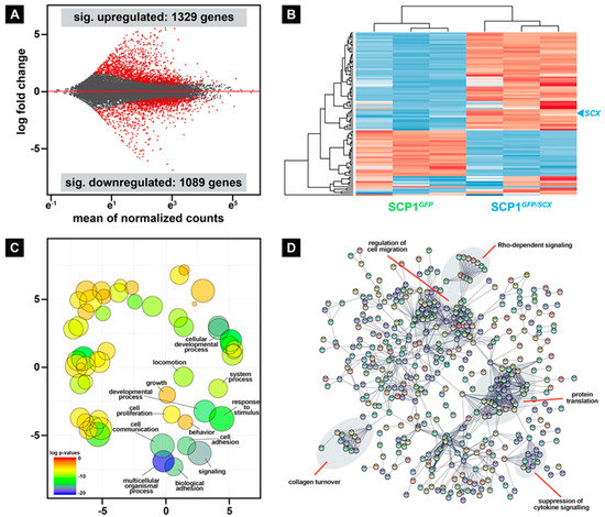 Cell pellets were created as described above, cultured for an additional 24 hours, and directly lysed in Trizol (Invitrogen, USA). RNA was isolated from three independent preparations following a standard protocol. RNA quality was measured with a BioAnalyzer (Agilent Technologies, Santa Clara, CA USA), and libraries for sequencing were prepared with a SENSE mRNA-Seq Library Prep Kit V2 (Lexogen, Vienna, Austria). All libraries were sequenced on a HiSeq1500 device (Illumina, San Diego, CA, USA) with a read length of 50 bp and a sequencing depth of approximately 20 million reads. After demultiplexing, reads were aligned to the human reference genome (version GRCH38.92) with STAR [44]. Differential gene expression analysis was performed using DESeq2 [45], and an adjusted p-value of less than 0.05 was set to determine significant changed genes between SCP1GFP and SCP1GFP/SCX cell pellets. Gene ontology and functional protein association networks were visualized with REVIGO or STRING, respectively [25,46]. Furthermore, RNA-Seq data were examined to spot possible candidate genes.