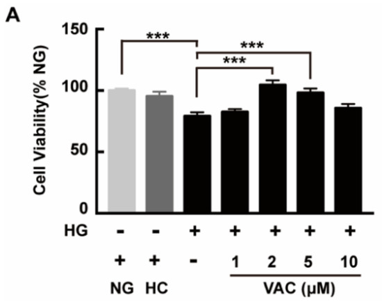 To investigate the effects of VAC on the viability of HMEC-1 cells after being stimulated with HG, a CCK-8 assay was used then. High glucose stimulation duration was determined based on peer works [20,21,22]. Results showed that the viability of HMEC-1 cells markedly decreased after being exposed to HG (p < 0.001), which was attenuated by VAC. Meanwhile, VAC treatment with a concentration of 2 μΜ conducted the maximum protective effect (p < 0.001, Figure 1). Simultaneously, there was no difference in cell viability between the NG (glucose 5 mM) group and HC (mannitol 30 mM) (p < 0.001, Figure 1).