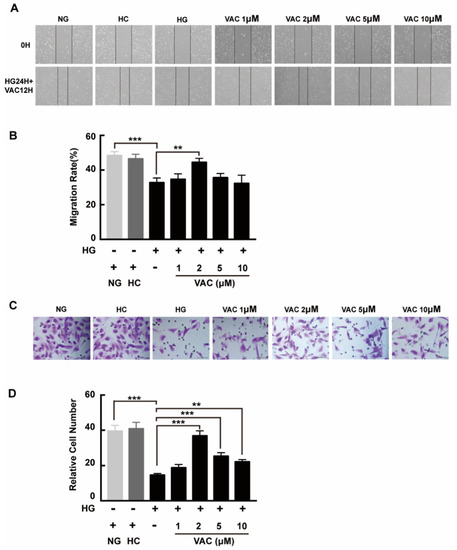 We next asked whether VAC could promote migration on high glucose conditions with a transwell assay and a scratch assay. Compared with the NG group, cell migration was obviously decreased in the HG group. Additionally, this phenotype was enhanced after VAC treatment. Similarly, there was no difference between the NC group and the NG group, while the wound healing rate of the HG group was apparently decreased (p < 0.01, Figure 2A,B). Statistical results demonstrated the VAC treatment with a dose of 2 μΜ had the most effective migration promoting effects (p < 0.01, Figure 2C,D).
