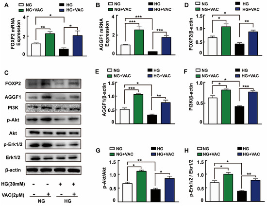 Through activating Akt and inhibiting reactive oxygen species generation, AGGF1 reduced the damaging effects of hyperglycemia on endothelial progenitor cells (EPCs) in vivo [23]. AGGF1 inhibited the NF-κB signaling via inactivation of the ERK pathway to lessen inflammation in a mouse hind limb ischemia model [24]. These studies indicate that AGGF1 may be an upstream regulatory protein of the PI3K/Akt and Erk1/2 pathways. Qianru He et al. reported that the silencing of FOXP1/FOXP2 downregulated the expression of AGGF1, reduced the viability, migration, and tube formation in U87 glioma-exposed endothelial cells [13]. We wondered whether VAC could promote PI3K/Akt and Erk1/2 phosphorylation and cell migration by regulating FOXP2/AGGF1. Subsequently, the mRNA and protein expression of FOXP2 and AGGF1 were detected. We found that HG strongly inhibited FOXP2 and AGGF1 expression both on transcription and protein levels (p < 0.05, Figure 3A–E), whereas being treated with VAC increased those expressions (p < 0.05, Figure 3C–E).