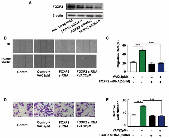 To further explore the mechanism of VAC promoted cell migration, siRNA was introduced to interfere with the expression of FOXP2 in HMEC-1 cells. The Western blotting results showed that the FOXP2 protein was silenced specifically and effectively by FOXP2 siRNA-3 (Figure 4A). Compared with the control group, cell migration of the VAC group was effectively enhanced (p < 0.001, Figure 4B–E), while cell migration was obviously decreased after FOXP2 knockdown (p < 0.001, Figure 4B–E). However, we noticed that FOXP2 siRNA had no effects on cell migration compared with the control group (p < 0.001, Figure 4B–E). The above results indicate that the effects of VAC on cell migration was obviously inhibited without FOXP2.