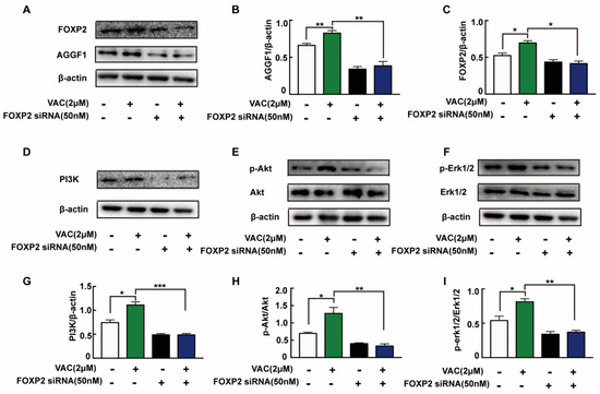 Expression of related proteins after knockdown of FOXP2. HMEC-1 cells were pre-incubated with FOXP2 siRNA for 6 h then changed medium and cultured for another 12 h. Then cells were treated with HG (30 mM) for 24 h and VAC (2 μΜ) for 12 h. Western blotting showing protein expressions of PI3K, p-Akt, Akt, p-Erk1/2, Erk1/2,FOXP2, and AGGF1 (A,D,F,H). Bar groups showing the quantification of AGGF1/β -actin (B), FOXP2/β -actin (C), PI3K/β -actin (E), p-Akt/Akt (G), and p-Erk1/2/Erk1/2 (I). Values are mean ±SEM, * p < 0.05, ** p < 0.01, *** p < 0.001, n = 3 for each group. VAC, vaccarin.