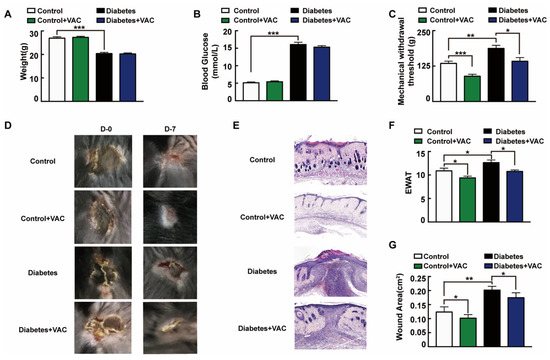 We next asked whether the administration of VAC ameliorates chronic wound healing in T1DM mice. To confirm the effects of VAC on diabetic chronic wounds, we constructed an animal model of diabetic pressure ulcers. We found that the body weight slightly decreased and blood glucose strongly raised in the T1DM group (Figure 6A,B). Diabetic patients easily give rise to insensitive foot ulcerations because of peripheral nerve hypofunction, and those who inconveniently cannot move will also have insensitive pressure injuries [25]. The tail pressure Randall–Sellito test demonstrates a significant mechanical hypoalgesia in untreated diabetic mice, and the mechanical nociceptive threshold was enhanced in untreated diabetic mice, which could be restored in the VAC-treated groups (Figure 6C). The dorsal wound region was observed and photographed on days 0 and 7 after the ulcer formed. For the same stress stimuli, diabetic mice developed more severe skin ulcers than healthy mice. This suggested that the intrinsic physiological mechanisms of skin adaptive protection against ischemic stress had been impaired in diabetic mice [26]. As Figure 6D,E,G shows, VAC dramatically accelerates the wound healing rate. The wound almost closed completely on day 7 in the control group treated with VAC. EWAT assessment also confirmed the above results (Figure 6F).