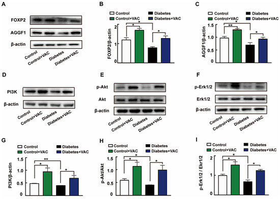 We next determined the molecular mechanism of VAC on diabetic chronic ulcers. In concordance with the in vitro experiments, the protein expressions of FOXP2 (Figure 7A,B), AGGF1 (Figure 7A,C), PI3K (Figure 7D,G), and phosphorylation levels of Akt (Figure 7E,H) and Erk1/2 (Figure 7F,I) were significantly decreased in diabetic wound skin tissues. These changes were all reversed by VAC. All these results demonstrate that VAC accelerates diabetic chronic wound healing through the FOXP2/AGGF1 pathway to promote PI3K/Akt and Erk1/2 activation.