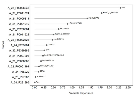 | Probe Name | Gene Symbol | Variable Importance | AUC (95% CI) |