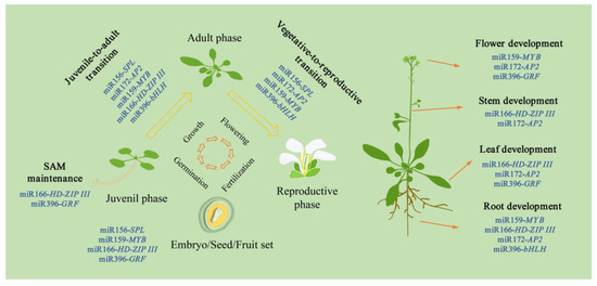 MiRNAs and their targets regulate the developmental phase transitions in plants. MiRNA-target modules not only regulate the juvenile-to-adult and vegetative-to-reproductive transitions, but also control the normal transitions within the formation of tissues/organs, including SAM, root, stem, leaf, flower and embryo/seed/fruit. The functions of the miRNAs, included in Figure 1, have been demonstrated in many plant species.