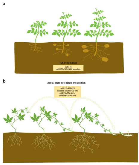 - Bhogale, S.; Mahajan, A.S.; Natarajan, B.; Rajabhoj, M.; Thulasiram, H.V.; Banerjee, A.K. MicroRNA156: A potential graft-transmissible microRNA that modulates plant architecture and tuberization in Solanum tuberosum ssp. andigena. Plant Physiol. 2014, 164, 1011–1027. [Google Scholar] [CrossRef]