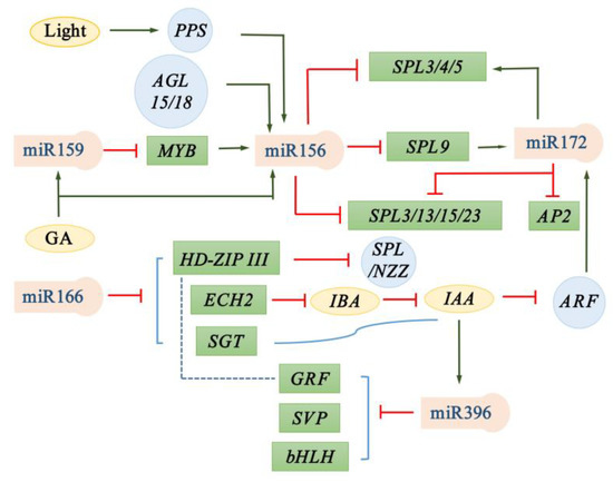 MiR159 has also been demonstrated to be involved in the transition of the juvenile-to-adult phase, independently of GA. In Arabidopsis, the mir159ab double mutant had a significantly faster rate of leaf initiation and much smaller leaves than wild-type plants [41]. mir159ab also produced abaxial trichomes later than wild-type plants, whereas miR159a-overexpressing plants produced abaxial trichomes significantly earlier than normal [41]. These findings suggest that miR159 could act as a positive regulator in the juvenile-to-adult transition of plants. However, the miR159 was identified as a post-transcriptional negative regulator in the root growth of Arabidopsis [42]. The mir159ab double-mutant generated a larger meristem in root than wild type and formed longer roots, accompanied by the increased expression of three targets, MYB33, MYB65 and MYB101 [42].
