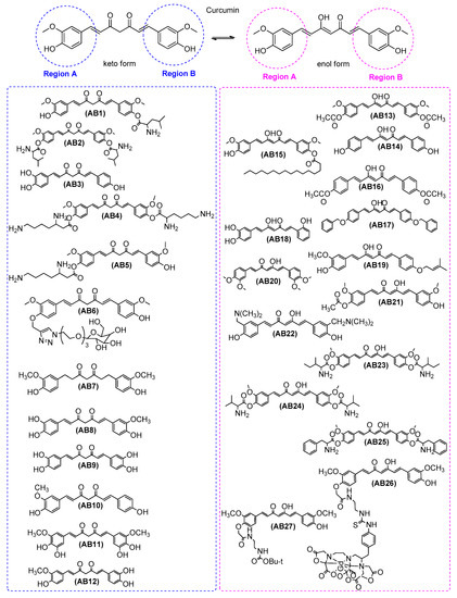 Villaflores et al. [45] studied the effects of curcumin and AB10 on amyloid-β precursor and tau proteins through the internal ribosome entry sites. AB10 was observed to inhibit the phosphorylation of both tau pS262 and pS396 (Figure 1).