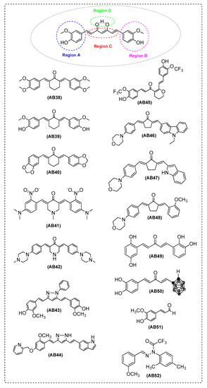 Zhai et al. [9] synthesized new asymmetric curcumin analogues which were evaluated as potential multifunctional agents for the treatment of AD. Compounds AB46, AB47, and AB48 showed high activity with 92.9%, 90.8%, and 91.8% inhibition ratio of self-mediated Aβ1-42 aggregation, respectively. In addition, compounds AB46, and AB48 exhibited high disaggregation ratios of Aβ1–42 aggregation fibrils, i.e., 84.5% and 83.2% respectively. AB48 could reduce or retard β-sheet structural formation and only slightly influence the content of β-helix structure of the peptide. The results from an SAR analysis showed that therigidity of the bridge between the two aromatic moieties is more preferable, as well as the expansion of the aromatic rings. The presence of an electron-releasing group on the aromatic ring was found to be more favorable for the inhibition of Aβ1–42 aggregation as compared with an electron withdrawing group. Methoxy substitution on aromatic rings led to derivatives with higher inhibition, whereas compounds with nitro substitution presented decreased activity. For compounds with the same substitution on the aromatic ring, the position of the substitution affected the result. For compounds with electron-releasing groups, the potency range was as follows: ortho >meta >para. On the contrary, compounds with electron-withdrawing groups followed the reverse order, para > middle >ortho. These results indicate that substituents with large conjugated structure or electron-releasing groups, or high cloud densityimprove the activity (AB46, 91.8% and AB47, 90.8%) (Figure 3 and Table 1).