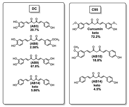 Chen et al. [54] found that poly-substituted hydroxylcurcuminoids are able to upregulate neprilysin, the most important Aβ-degrading enzyme. Thus, these compounds can be used to prevent AD. It is known that curcumin does not present this ability. The role of neprilysin is correlated with the late onset of AD since its expression level decreases with age and is inversely correlated with amyloid accumulation. Researchers have proposed four compounds, AB3, AB8, AB9, and AB11 that increase NEP activity, while curcumin does not. Treatment of APPswe/PS1dE9 double transgenic mice (B6C3-Tg(APPswe, PSEN1dE9)85Dbo/Mmjax) with AB8 or AB9 upregulated NEP levels in the brain and reduced Aβ accumulation in the hippocampus and cortex (Supplementary Data). Curcumin is well known to present poor solubility and bioavailability. However, the solubility and bioavailability of the above compounds would be greater than curcumin due to the presence of many hydroxylsubstituents on these curcuminoids (Figure 1 and Table 1).