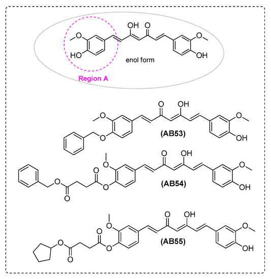 Furthermore, the introduction of a benzene ring etherified at one of the curcumin rings led to a more potent anti-inflammatory curcumin derivative (AB53). Acetylation, on only one side of the molecule, was associated with potent biological activity. However, the complexity and the spacer’s length attached to both rings decreased the activity. Indeed, a strong improvement in the activity was achieved when modifications were done on only one of the aromatic rings (AB54, AB55). When monofunctionalized diester curcumin derivatives were considered (AB54, AB55), it was observed that the improvement of the anti-inflammatory activity was reduced by the presence of bulky groups in the molecule. These bulky groups disturbed the molecular mechanisms by which these derivatives inhibited the production of IL-6. This observation needs further investigation. The researchers suggested that hydroxyl groups on the aromatic rings of the curcumin were elements of the pharmacophore, prerequisites for reducing the production of IL-6. Moreover, modifications appropriate to produce new analogues with potential anti-inflammatory activity targeting IL-6 includedthe following structural moieties: at least one hydroxyl group of the aromatic rings should not be modified, etherification and esterification of only one of the hydroxyl groups.