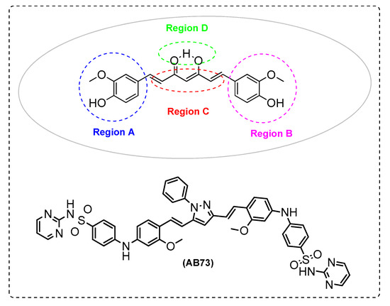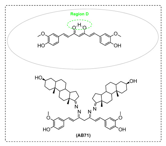Hitoshi Endo et al. [53] found that AB18 is the ideal in vitro amyloid-β aggregation inhibitor among synthesized curcumin analogues. AB18 also has water solubility that is 160 times higher than curcumin. The researchers applied SAR studies of curcumin analogues and found that a catechol motif pharmacophore wascapable of inhibiting Aβ aggregation. Furthermore, they described the following two new approaches for improved water solubility of curcumin analogues: (a) reduction of molecular planarity and (b) use a β-diketone moiety. The presence of hydroxyl group as a substituent on the aromatic ring of curcumin analogues seems to be significant in connection to a ketone group stabilizing the torsion of the o-phenol ring and neighboring olefin (Figure 1 and Table 1).