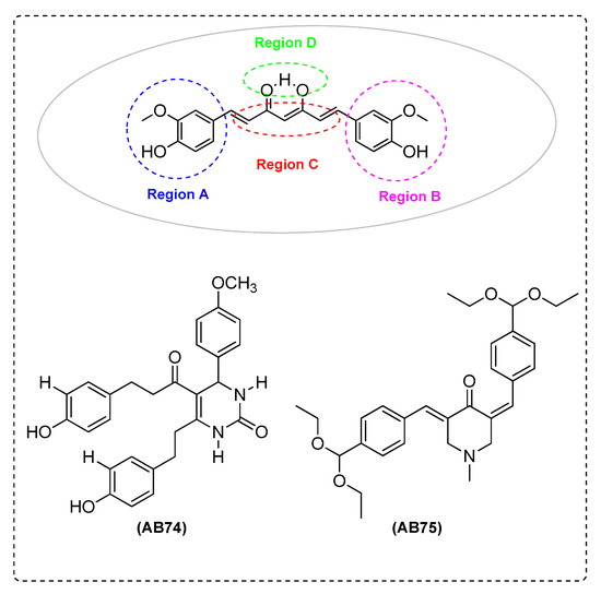 Yanagisawa et al. [30] synthesized four new curcumin derivatives which highly inhibited Aβ aggregation in SH-SY5Y cells (human neuroblastoma cell line, Supplementary Data). They proposed AB28, AB29, AB30 (Figure 2), and AB45 (Figure 3) as therapeutic candidates for preventing AD. The in vitro results showed the curcumin derivative with a 1,7-bis(4′- hydroxy-3′-trifluoromethoxyphenyl) groupwas more potent than the derivative with a 1,7-bis(4′-hydroxy-3′-methoxy phenyl) group, suggesting that trifluoro methoxy groups on aromatic rings are favorable groups for inhibiting Aβ aggregation. In addition, curcumin derivatives that showed effects on Aβ aggregation have at least one hydroxy group as a substituent on the aryl ring groups in their structure. The absence of this group from the curcumin is correlated with the disappearance of any effects on Aβ aggregation. The results supported that the presence of hydroxyl groups on the aromatic groups in curcumin derivatives are essential to inhibit Aβ aggregation. The curcumin derivatives AB28, AB29, AB30, and AB45 are substituted at the C-4 position. Taken together, they assumed that the combination of 1,7-bis(4′-hydroxy-3′-trifluoromethoxyphenyl) groups and a suitable substituent at the C-4 position are crucial for the therapeutic effect of curcumin derivatives (Table 1).