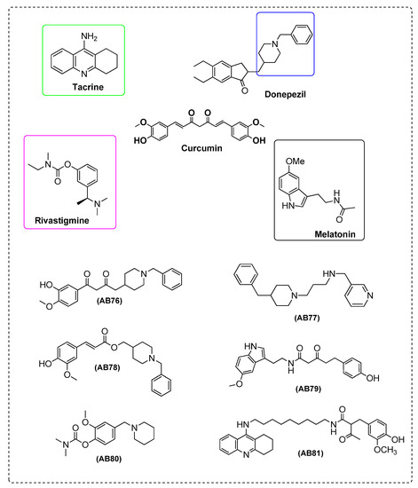 Aswathy et al. [57] designed novel amyloid-β aggregation inhibitors using quantitative structure–activity relationship (QSAR); pharmacophore modeling; molecular docking; and absorption, distribution, metabolism, excretion and toxicity (ADMET) prediction models. They selected six lead molecules which indicated the best results, AB32, AB33, AB34, AB35, AB36, and AB37 (Figure 2).