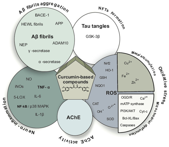 Gagliardi et al. [80] showed that treatment with curcuminoids, in a cell model PBMC (peripheral blood mononuclear cells, Supplementary Data), inhibited the activation of inflammation. AB14 showed the most potent protective activity decreasing levels of NF-κB and BACE1 and the inflammatory cascade in cells from AD patients (Figure 1).