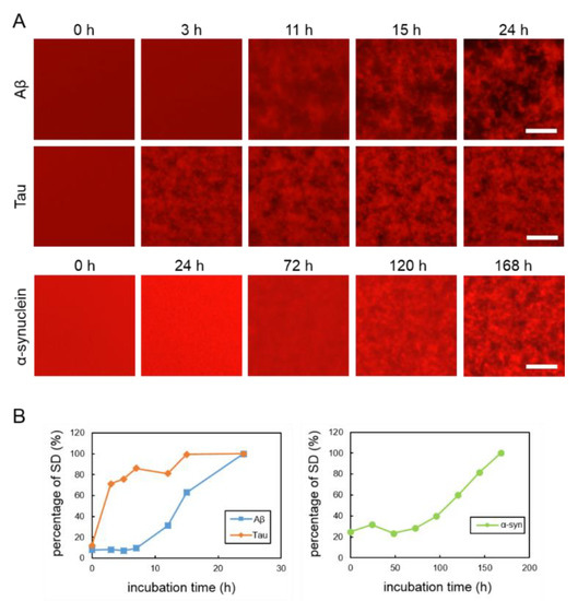 To observe the aggregation and fibrillization of Aβ, tau and α-synuclein proteins, we performed real-time imaging of each protein bound to the QDs via nonspecific binding using conventional fluorescence microscopy. Each protein sample was mixed with 30 nM QdotTM 605 ITKTM amino (PEG) quantum dots (QD605) (Q21501MP; Thermo Fisher Scientific, Waltham, MA, USA) and incubated in a 1536-well plate at 37 °C. This imaging technique was able to directly monitor the physiological aggregation of each amyloid protein simply by adding commercially available QDs. We also confirmed that these amyloid aggregates can be visualized by QD655 (Q21521MP; Thermo Fisher Scientific) (data not shown). Aβ and tau aggregation can be visualized after incubation for 24 h, the ideal period reported in our previously study, which showed that tau protein aggregation was faster than Aβ aggregation [21] (Figure 1A, top and middle panels). Aggregation of α-synuclein was not observed by only incubating the monomer. Therefore, in this study, aggregation of α-synuclein was observed by adding α-synuclein aggregates that had been incubated at 37 °C for five days with stirring, as seeds which can promote α-synuclein protein aggregation (Supplementary Figure S2). The α-synuclein aggregation process with 20% seed was observed for 168 h (Figure 1A, bottom panel). Aβ and tau completely aggregated within 24 h, whereas the α-synuclein protein needed more time to aggregate (168 h), even if the 20% seeds were added. These results indicate that the imaging technique using QDs can be applied to the aggregation of various proteins. In our previous study, we suggest that standard deviation (SD) values of fluorescence intensities of each pixel were correlated with the amount of amyloid protein aggregates [24]. As amyloid aggregations progressed, the variability of the SD values also increased. In this experiment, we compared the changes to SD values of Aβ, tau, and α-synuclein proteins during incubation (Figure 1B). The individual changes in the curves of the SD values of these three proteins were different. The SD values of Aβ and tau proteins increased more sharply than that of the α-synuclein protein. The SD value of the α-synuclein protein increased very slowly over time. The SD values of Aβ and tau peaked at around one day and that of α-synuclein at around one week. After these protein aggregations and their SD values peaked, the values no longer increased and plateaued.