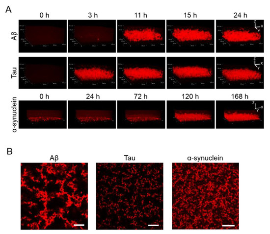 (A) 3D observation of the aggregation of Aβ, tau, and α-synuclein. Thirty-micrometer Aβ and 10-µΜ tau were incubated for 24 h. Ten-micrometer α-synuclein was incubated for 168 h. Sequential 3D reconstruction images of each time point are represented. (B) Image of the slices of aggregation of each protein in panel A. Note that aggregate sizes and densities are different among all three proteins. Scale bar = 100 µm.