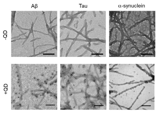 TEM was used to confirm whether these amyloid proteins (Aβ, tau, and α-synuclein) formed fibrils and to assess whether QDs bound to amyloid fibrils (Figure 3). A low-magnitude image showed that these amyloid proteins had misfolded fibrils in vitro (Figure 3, top panel). A high magnitude image revealed that QDs had bonded evenly along the amyloid fiber (Figure 3, bottom panel). These results are consistent with our previous report [25]. However, these amyloid fibrils are difficult to distinguish, because almost all of them show a linear morphology with a cross structure and irregular length. These fibers that formed can cause amyloidosis and organ dysfunction when they are deposited and accumulate in organs or tissues. These results suggest that QD-based imaging can analyze three-dimensional amyloid aggregation and deposition in vivo in more detail than TEM imaging.