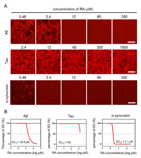 Using the MSHTS system, different concentrations of RA were used to evaluate the inhibitory activity of RA on the aggregation of three amyloid proteins (Aβ, tau, and α-synuclein). After incubation at 37 °C, images were captured by fluorescence microscopy (Figure 4A). Two-dimensional images were analyzed by ImageJ software to determine the SD value. The EC50 values of inhibitors were estimated from the inhibition curves (Figure 4B). The EC50 of Aβ, tau, and α-synuclein are 20.6 μM, ND, and 2.1 μM, respectively. RA inhibited the aggregation of Aβ and α-synuclein proteins in vitro in a dose-dependent manner, even though their EC50 values were different. However, tau aggregation was not completely inhibited, even when 1500-µM RA was used. Although tau aggregates were slightly reduced in the presence of 1500-µM RA, the EC50 could not be determined, because the SD value did not fall below 50%. These results indicate that the inhibitory activity of RA increased in the order of α-synuclein, Aβ, then tau.