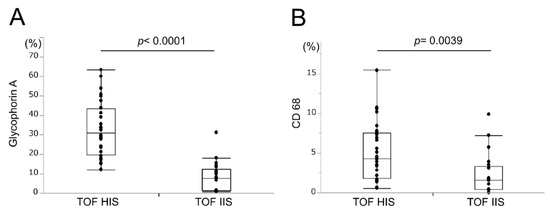Overall, high glycophorin A, high CD68 expression, and low neovascularization with pericytes in the TOF-HIS group, and low glycophorin A, low CD68 expression, and high neovascularization with pericytes in the TOF-IIS group were found (Figure 3).