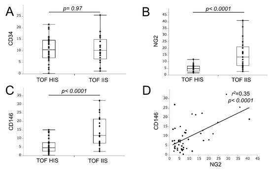 There was no significant difference in the mean number of neovessels stained with CD34 between the groups (10.7 ± 1.0 vs. 10.6 ± 1.3; p = 0.97; Figure 2A), but the mean number of neovessels stained with NG2 was significantly higher in the TOF-IIS group than in the TOF-HIS group (5.0 ± 0.4 vs. 15.5 ± 2.3; p < 0.0001; Figure 2B). Furthermore, the TOF-HIS group had a significantly lower mean number of CD146-positive neovessels than the TOF-IIS group (5.9 ± 0.8 vs. 13.9 ± 1.9; p < 0.0001; Figure 2C). These statistical results are presented in Table 2. The results were similar when two observers analyzed the results independently, and there was low interobserver variability (Table 3). There was a significant correlation in the mean numbers between NG2 and CD146-positive neovessels (Figure 2D). However, there was no correlation between the mean number of NG2-positive neovessels and the CD68-positive area (r2 = 0.048; p = 0.13). In addition, there was no significant correlation between the mean number of CD146-positive neovessels and the CD68-positive area (r2 = 0.07, p = 0.07).